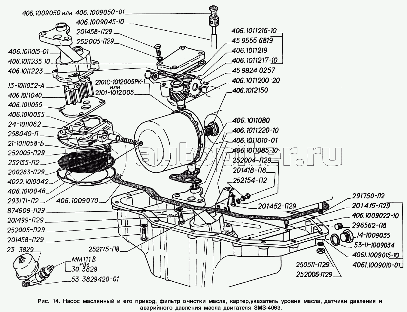Насос масляный и его привод, фильтр очистки масла, картер, указатель уровня масла, датчики давления и аварийного давления масла двигателя ЗМЗ-4063