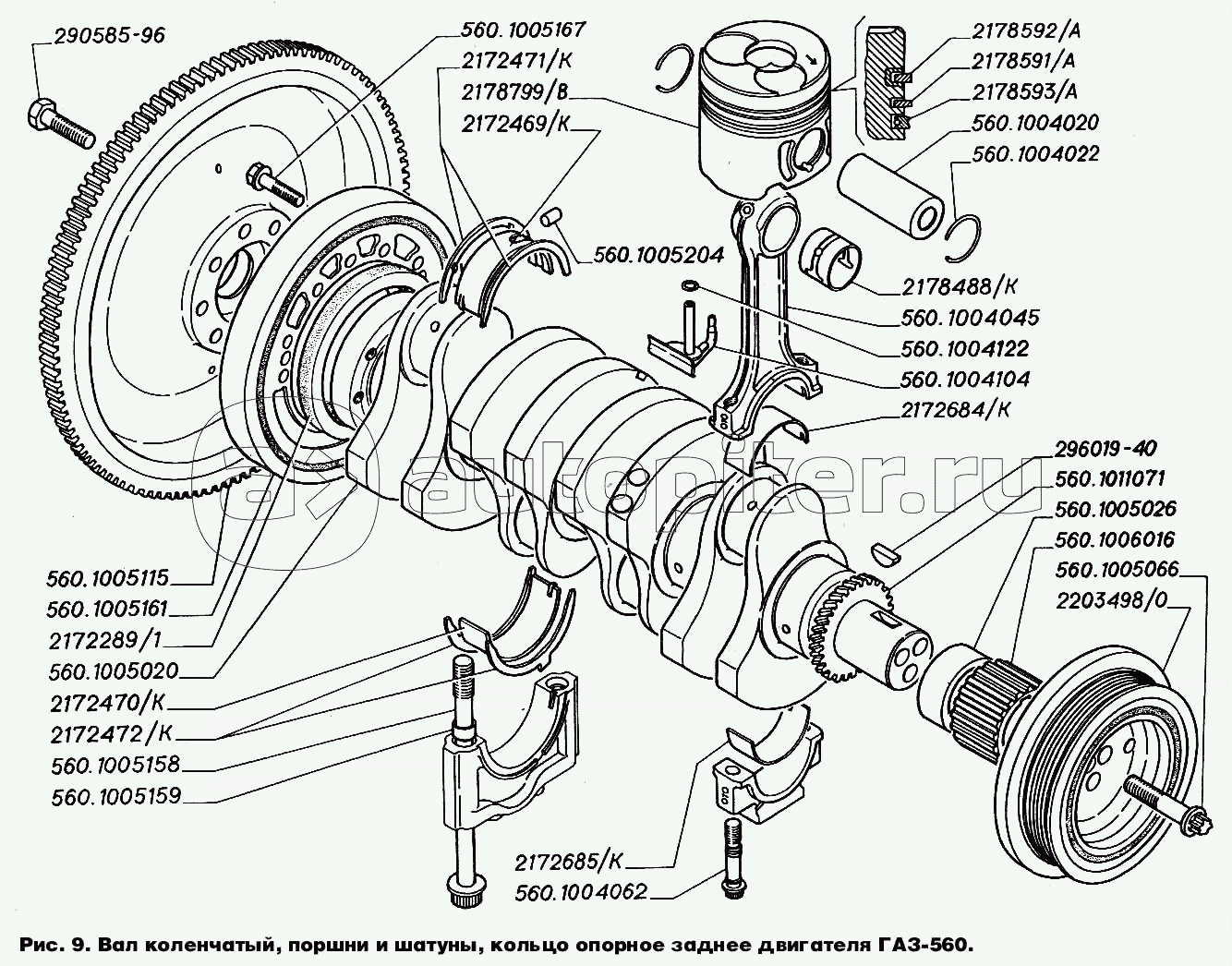 Вал коленчатый, поршни и шатуны, кольцо опорное заднее двигателя ГАЗ-560