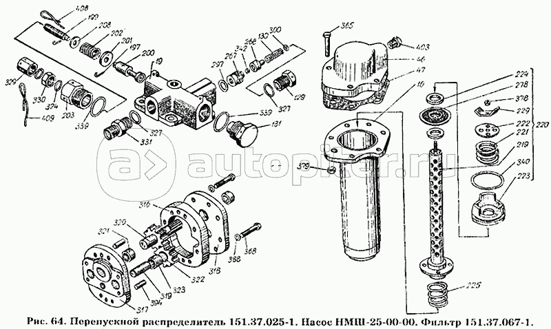 Перепускной распределитель 151.37.025-1. Насос НМШ-25-00-00. Фильтр 151.37.067-1