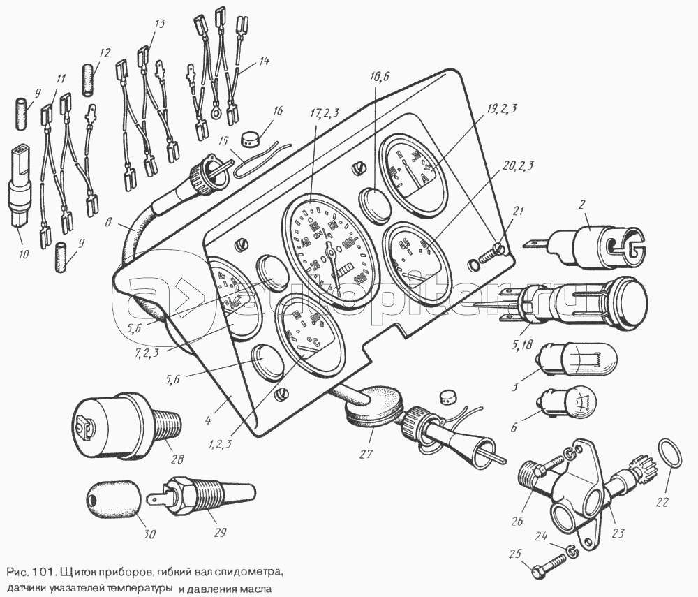 Щиток приборов, гибкий вал спидометра, датчики указателей температуры и давления масла