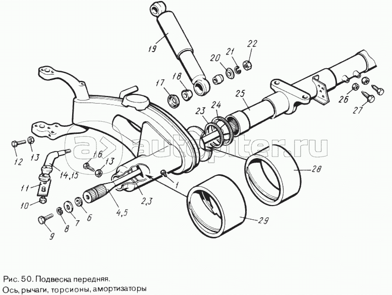 Рычаги, торсионы, амортизаторы, ось передней подвески