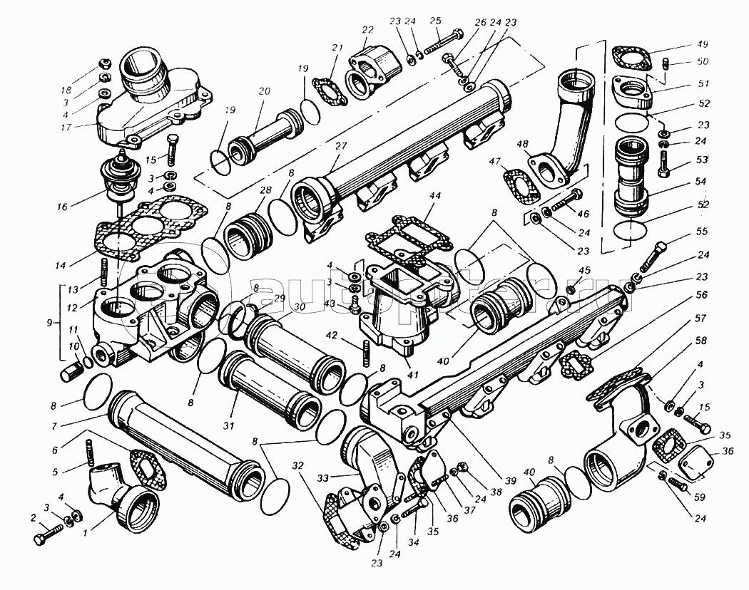 Трубы и термостаты системы охлаждения двигателя ЯМЗ-8423.10