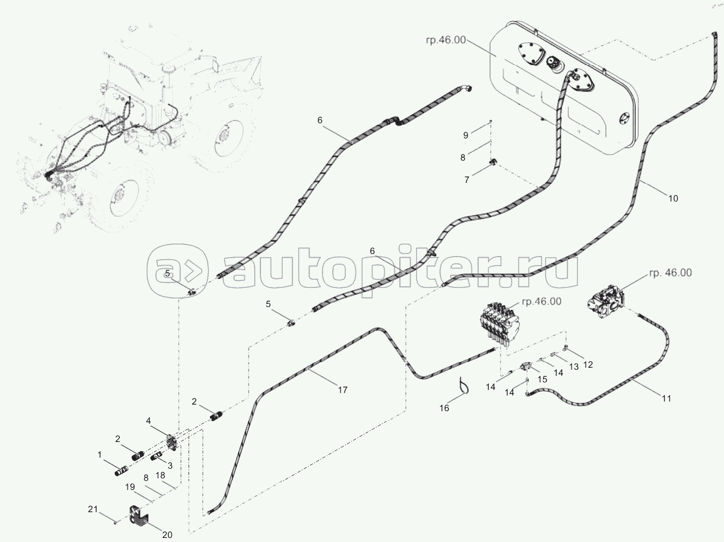 Установка двигателяРамаПодвескаКолесаГидросистема управления поворотомУстановка блока управления КППСистемаПриборыУстановка инструментальных ящиковСистема рабочего оборудованияУстановка блокировки гидроцилиндровМеханизм навескиУстановка стеклоомывателейКабинаЛестницаМост ведущийКомплект запасных частей, инструмента и принадлежностейКомплект заглушекТягово-сцепное устройство шарового типаПередача мощности к гидросистеме орудияУстановка преобразователяУстройства защитныеУстановка бака для водыМеханизм отбора мощностиРедуктор односкоростной